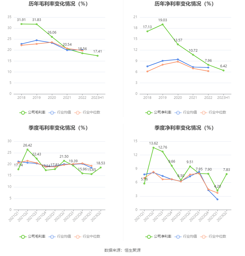 2023年上半年,公司毛利率为17.41%,同比下降2.22个百分点;净利率为6.42%,较上年同期下降1.56个百分点。从单季度指标来看,2023年第二季度公司毛利率为18.53%,同比下降2.97个百分点,环比上升2.88个百分点;净利率为7.83%,较上年同期下降1.68个百分点,较上一季度上升3.63个百分点。