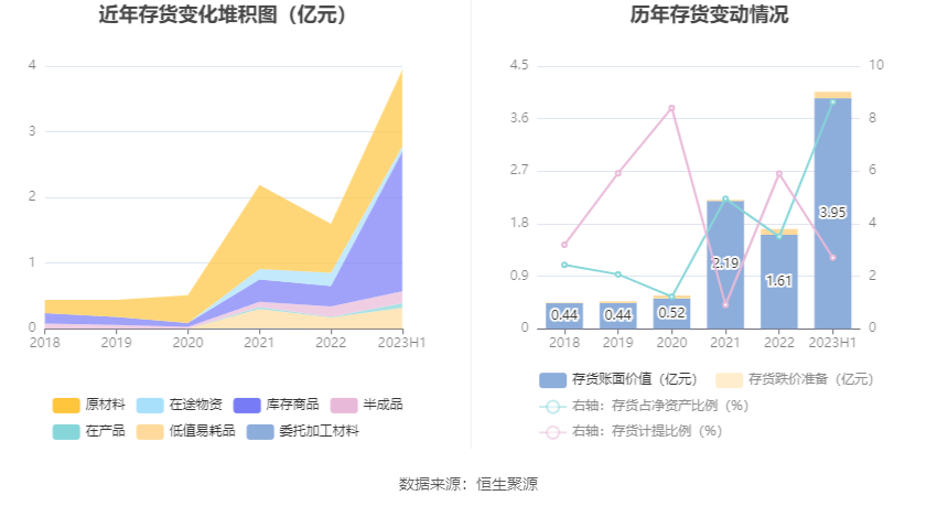 从存货变动来看,截至2023年上半年末,公司存货账面价值为3.95亿元,占净资产的8.64%,较上年末增加2.34亿元。其中,存货跌价准备为1098.53万元,计提比例为2.71%。