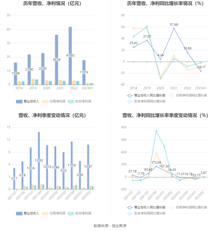 根据半年报,公司第二季度实现营业总收入10.87亿元,同比增长3.87%,环比增长57.78%;归母净利润8840.73万元,同比下降5.61%,环比增长138.77%;扣非净利润7780.61万元,同比增长0.98%,环比增长143.35%。