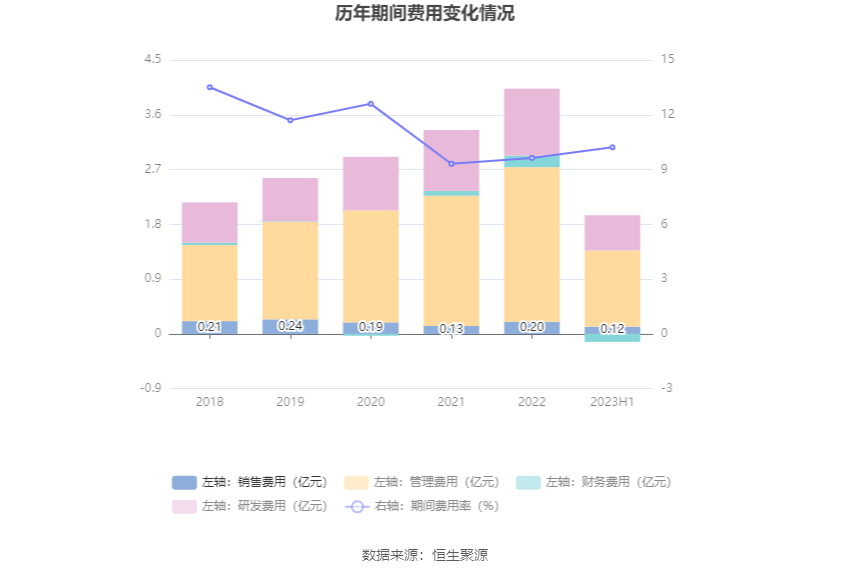 2023年上半年,公司期间费用为1.82亿元,较上年同期减少4036.73万元;期间费用率为10.22%,较上年同期下降0.25个百分点。其中,销售费用同比下降16.36%,管理费用同比下降8.97%,研发费用同比下降0.74%,财务费用由去年同期的1207.26万元变为-1321.91万元。
