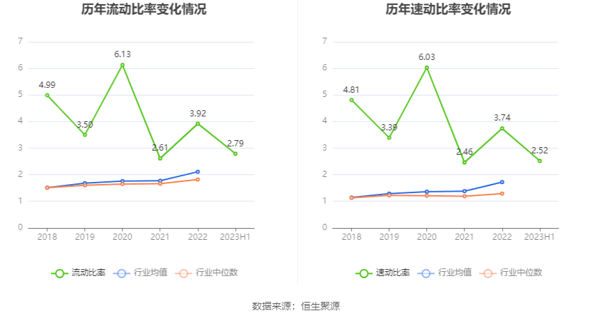 2023年上半年,公司流动比率为2.79,速动比率为2.52。