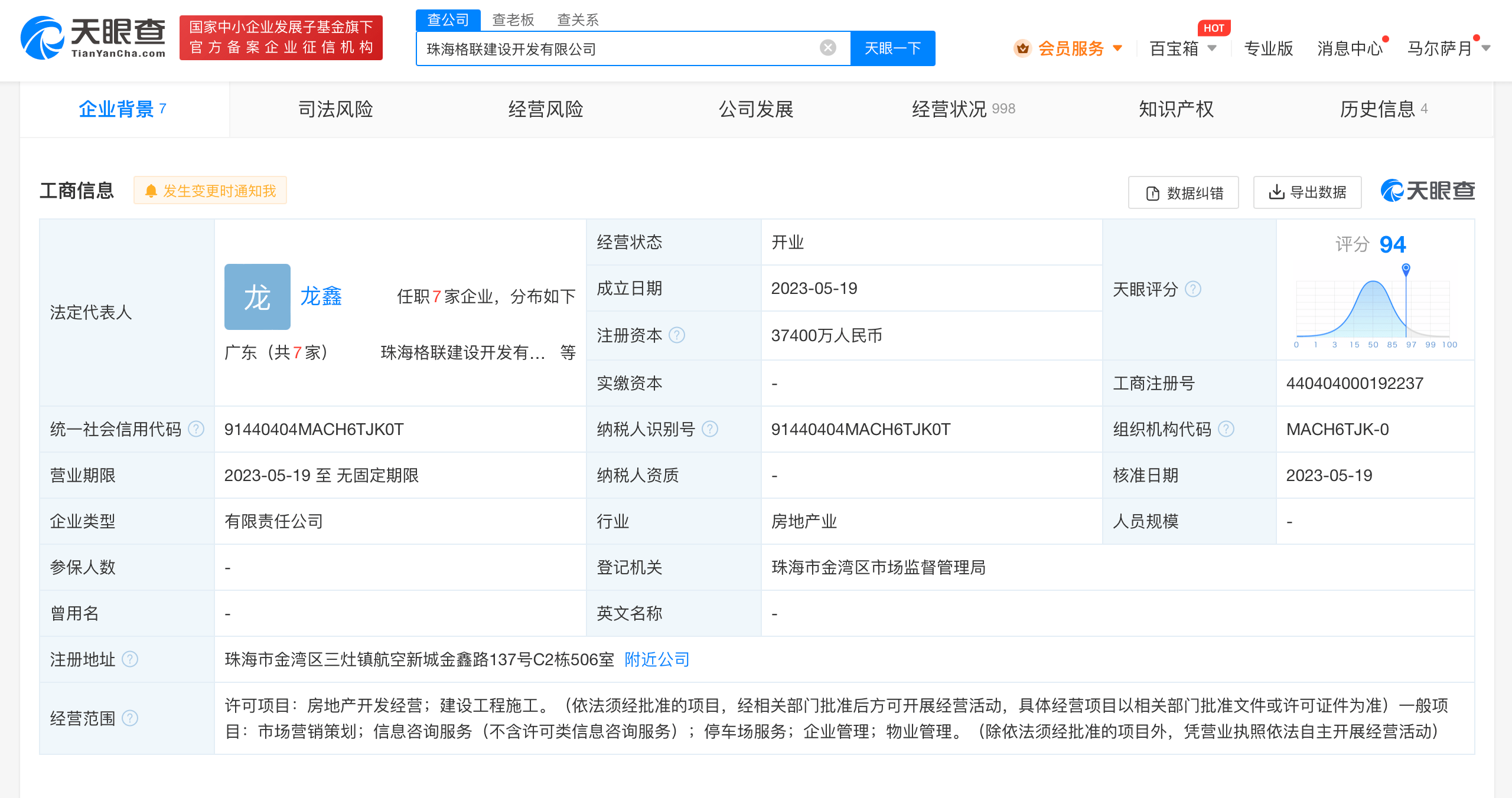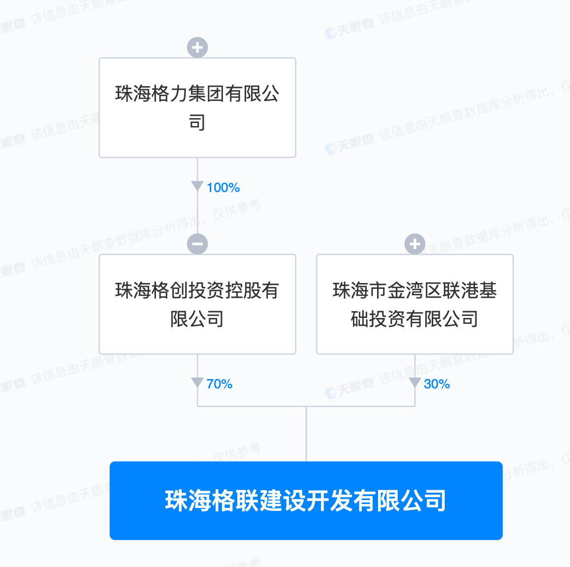 天眼查App显示,近日,珠海格联建设开发有限公司成立,法定代表人为龙鑫,注册资本3.74亿人民币,经营范围含房地产开发经营、建设工程施工、市场营销策划、停车场服务、物业管理等。股权全景穿透图显示,该公司由格力集团旗下珠海格创投资控股有限公司、珠海市金湾区联港基础投资有限公司分别持股70%、30%。