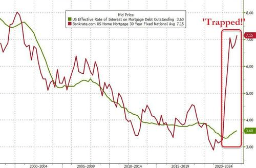 最新的住房数据进一步说明了房主不愿搬家,也不愿承担更高的抵押贷款利率这一趋势,因此潜在买家转而寻找新建筑。如下图所示,未偿还抵押贷款的平均有效抵押贷款利率仅为3.6%,是实际30年期抵押贷款利率的一半,这意味着数以千万计的房主被困住了,不愿出售其房产,否则他们将不得不重新申请更高的利率。