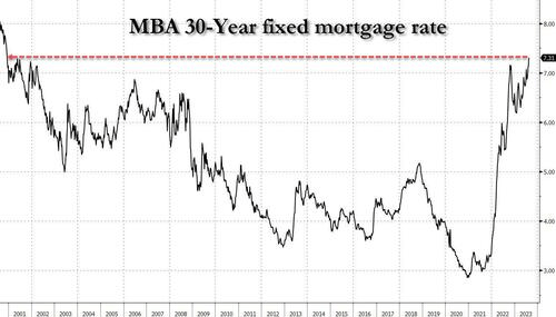 周三,美国抵押贷款银行家协会(MBA)报告称,上周美国抵押贷款利率升至2000年末以来的最高水平,使一项衡量需求的关键指标降至近30年来的最低水平。截至8月18日当周,30年期固定抵押贷款合约利率上升15个基点,至7.31%。