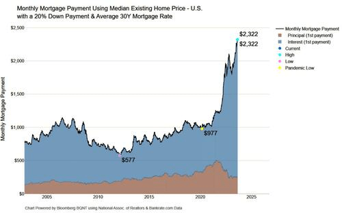 崩溃的原因很简单:由于住房负担能力处于或接近有记录以来的最低水平,平均每月抵押贷款还款额(基于房价中位数和平均30年固定利率抵押贷款,假设首付比例为20%)已激增至创纪录的23.22亿美元,是疫情前水平的两倍多。