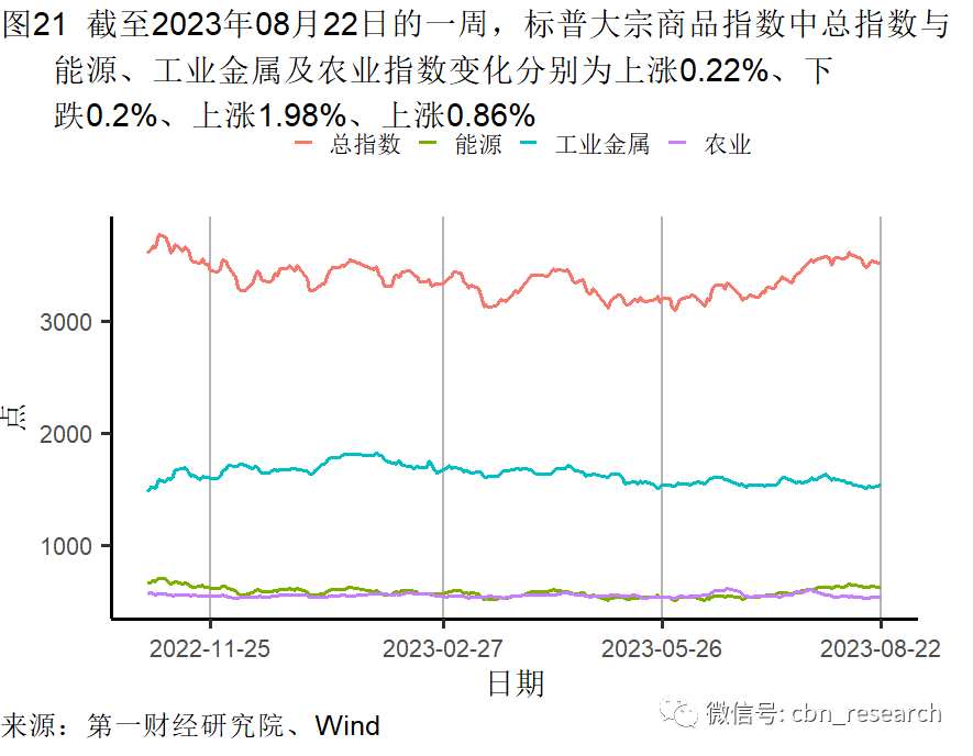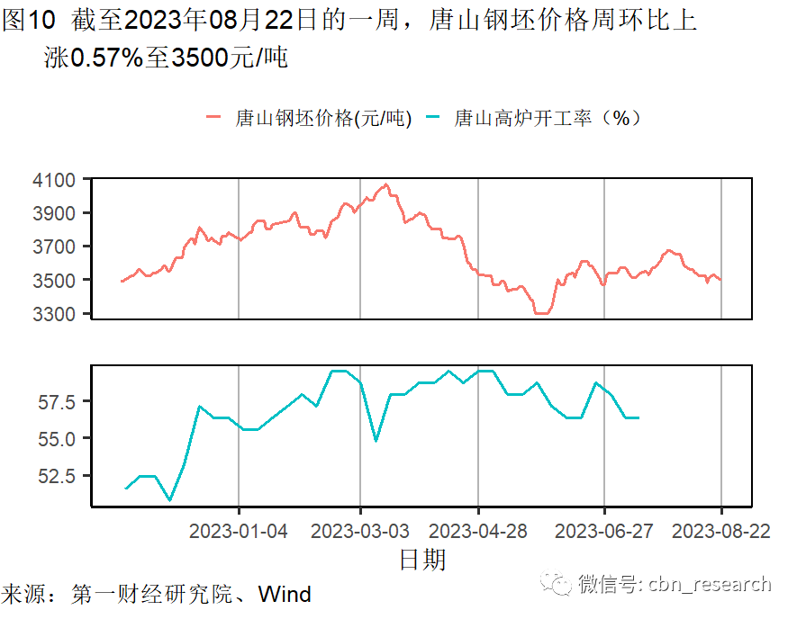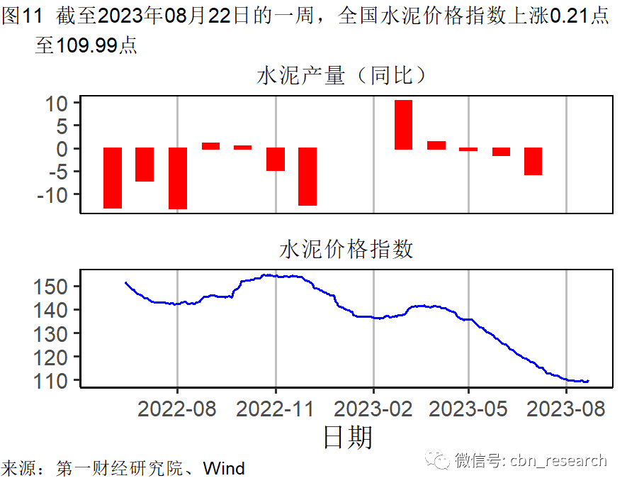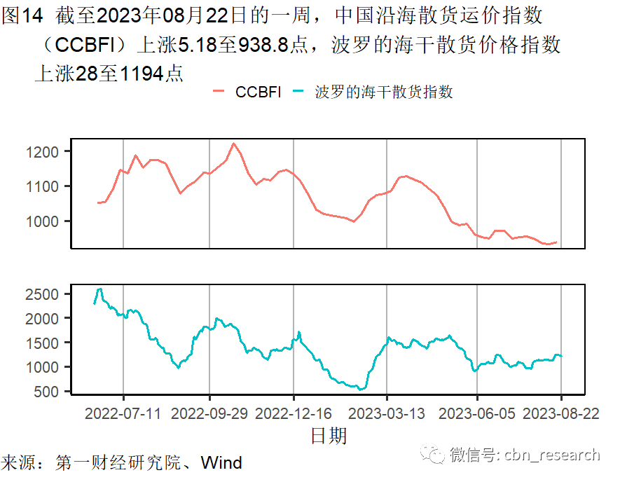 本周唐山钢坯价格回升,在截至8月22日的一周上升了0.57%,较过去一个月下降1.96%,较去年同期下降了5.15%。水泥价格继续走高,在截至8月22日的一周上升了0.19%,过去一个月下降了1.72%,较去年同期下降了23.31%。动力煤价格则与上月保持一致,较去年同期下降了2.05%。