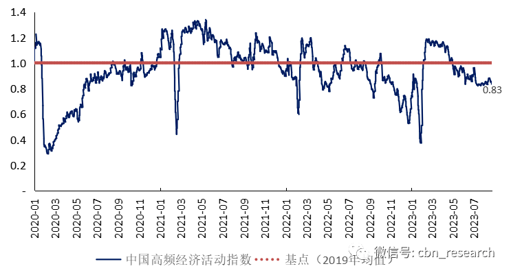 2023年8月22日第一财经中国高频经济活动指数(YHEI)为0.83,较8月15日下降了0.05。在截至8月22日的一周内,除“30城市商品房销售指数”回升了0.05,其余正向指标均下降,拉低了YHEI指数。其中,“8城市地铁流量指数”“沿海煤炭运价指数”和“进口干散货运价指数”在周内分别下降了0.05、0.06和0.02。