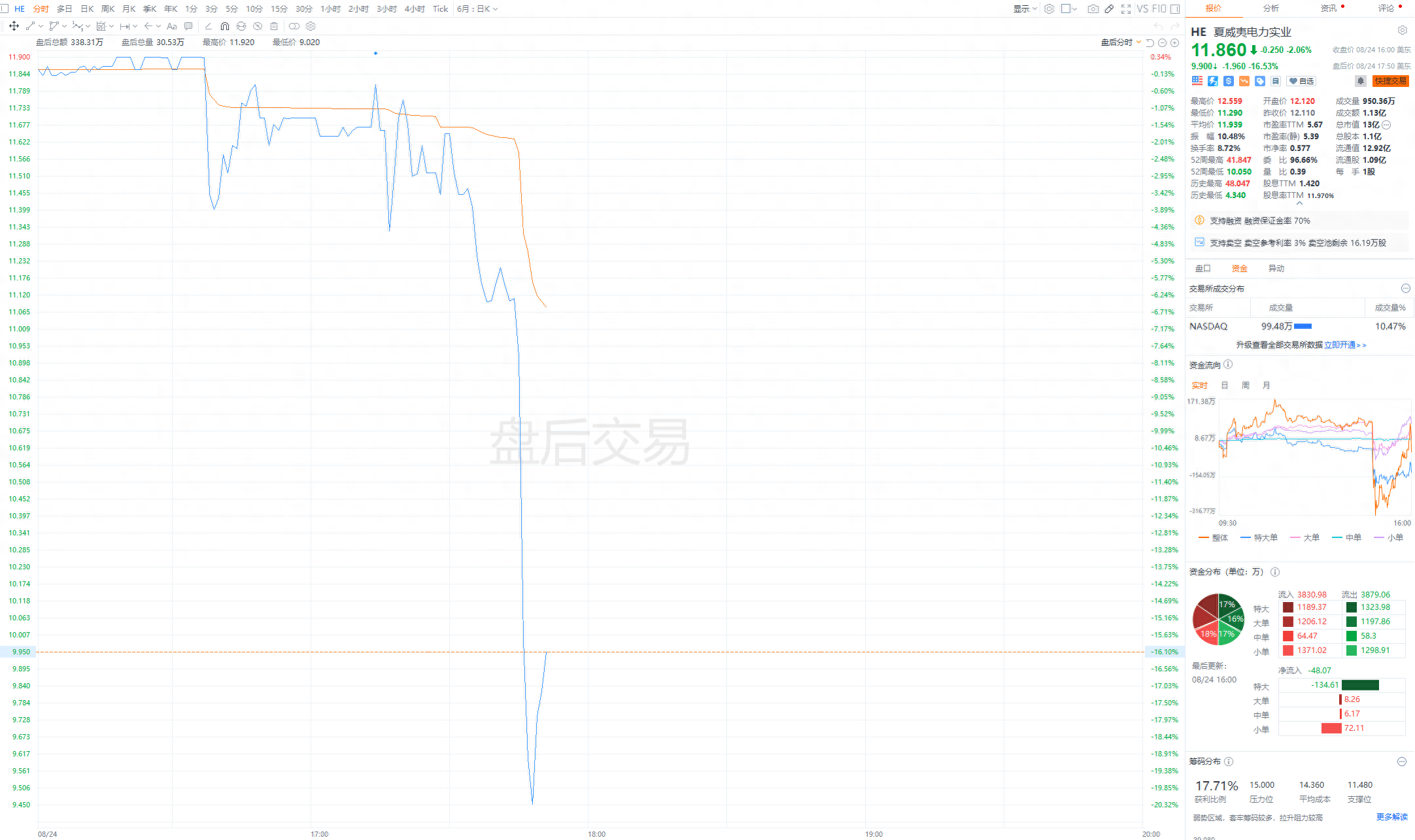 夏威夷电力公司(HE)美股盘后跌幅一度扩大至20%