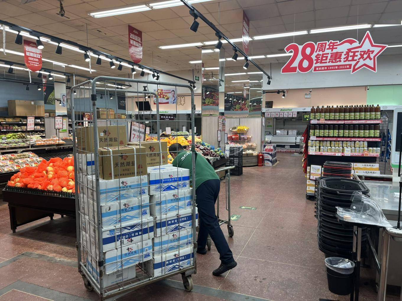 从24日下午到25日凌晨,中盐京津冀公司食盐配送中心陆续向物美南皋物流中心运送了4车食盐,使商超的食盐储备量大幅增加。与此同时,物美也连夜为各大门店补货,经过一晚的忙碌,超市的货架被重新填满。