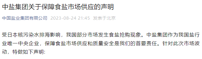 8月24日,“中国盐业集团有限公司”微信公众号发布《中盐集团关于保障食盐市场供应的声明》。