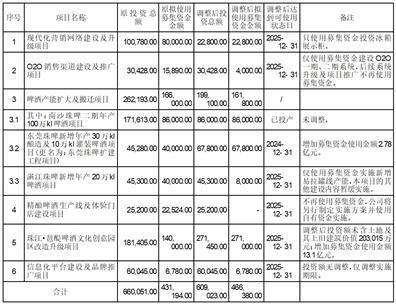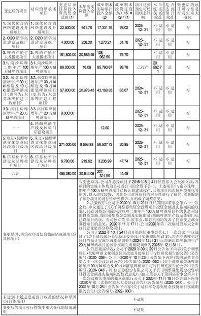 公司于2020年10月22日召开第四届董事会第六十一次会议,审议通过了《关于调整募集资金投资项目投资金额及实施期限的议案》,根据募集资金投资项目实际情况,公司决定调整除南沙珠啤二期年产100万kl啤酒项目外的其余项目的投资金额、使用募集资金金额及实施期限,本次调整不影响项目实施主体、不涉及新增投资项目。公司独立董事、监事会、保荐机构均发表了同意变更部分募投项目的意见。2020年11月17日,公司2020年第二次临时股东大会批准了上述变更募投项目相关事项。