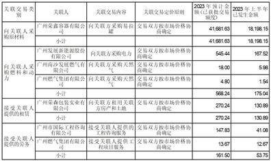 2023年3月28日召开的第四届董事会第七十四次会议及2023年4月21日召开的2022年度股东大会分别审议通过了《关于公司2023年度日常关联交易的议案》,同意与关联企业广州荣鑫容器有限公司、广州荣森包装实业有限公司、广州发展新能源股份有限公司、广州南沙发展燃气有限公司、广州市国际工程咨询有限公司和广州燃气集团有限公司发生采购、租赁、服务等关联交易。具体详见于2023年3月30日刊登于《中国证券报》、《证券时报》及巨潮资讯网的《关于2023年日常关联交易预计的公告》。截止2023年6月30日,公司日常关联交易发生情况如下: