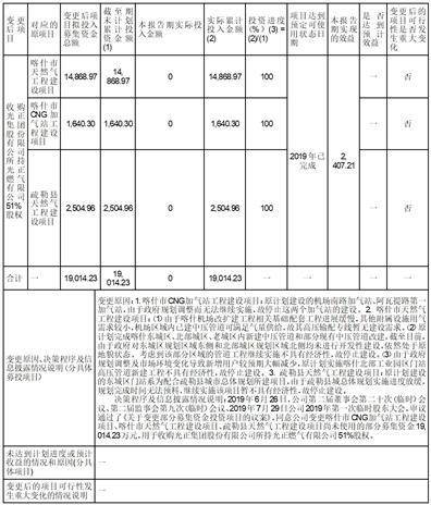 2019年6月26日,公司第二届董事会第二十次(临时)会议、第二届监事会第九次(临时)会议审议通过了《关于变更部分募集资金投资项目的议案》,同意公司变更喀什市CNG加气站工程建设项目、喀什市天然气工程建设项目、疏勒县天然气工程建设项目尚未使用的部分募集资金19,014.23万元,用于收购光正集团股份有限公司所持光正燃气有限公司51%股权。上述议案于2019年7月29日经公司2019年第一次临时股东大会审议通过。