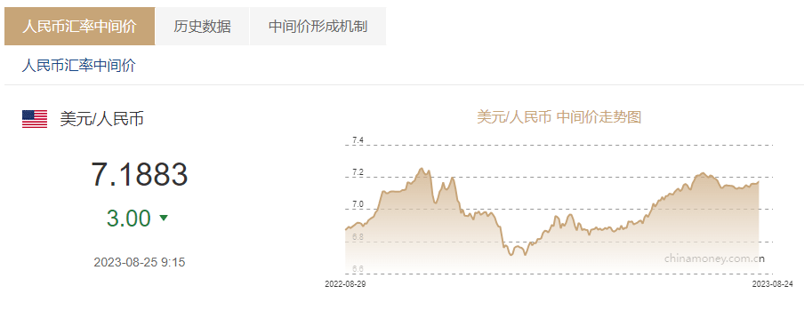 金融界8月25日消息 中国外汇交易中心显示,25日,人民币兑美元中间价报7.1883,调升3个基点。