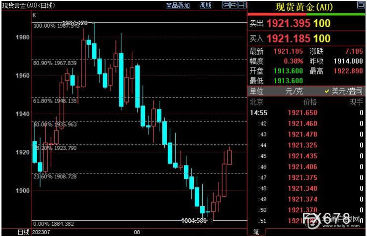 日线图上看,金价逼近1924美元,并有望进一步上摸1936美元,它们分别是1987美元-1884美元下行区间的38.2%斐波那契回档位和50%斐波那契回档位。