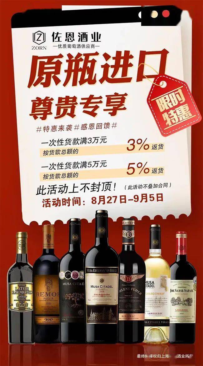 活动期间,您的购买金额越多,返货优惠就越多!我们没有设定返货上限,只要您达到相应的一次性货款要求,您将享受到相应比例的返货回馈!让优惠从开始一直延续,给您更加丰盈的红酒体验!