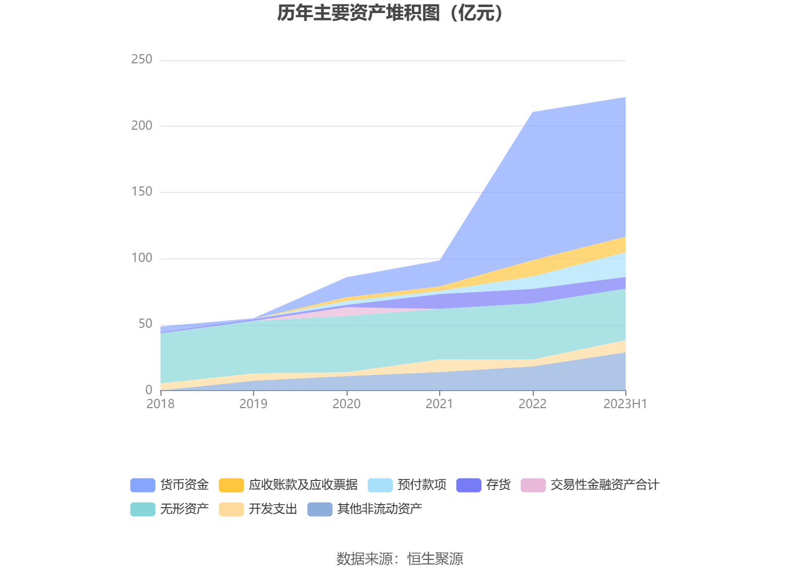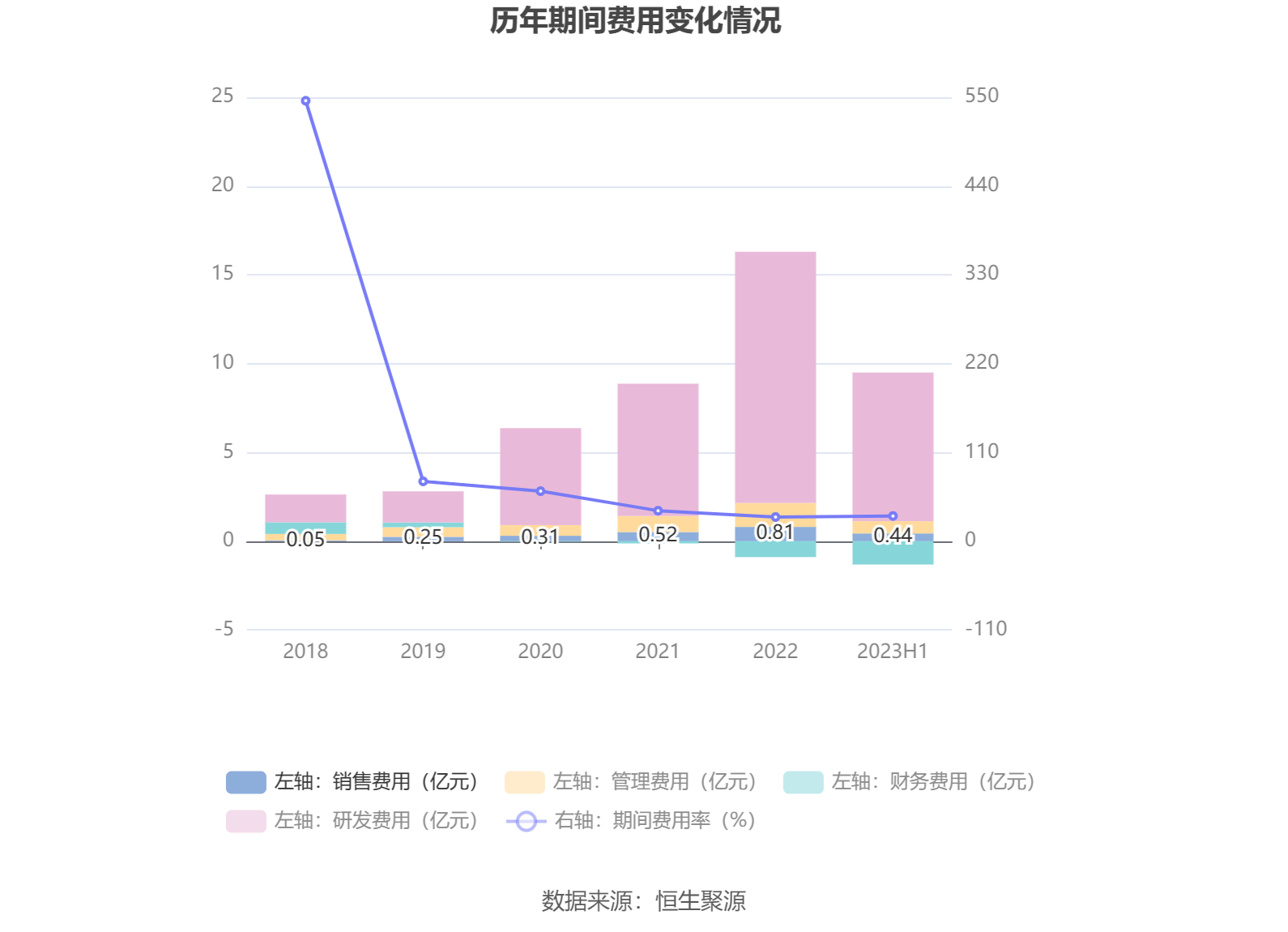 2023年上半年,公司期间费用为8.18亿元,较上年同期增加2754.25万元;期间费用率为31.34%,较上年同期上升0.08个百分点。其中,销售费用同比增长23.24%,管理费用同比增长10.61%,研发费用同比增长20.2%,财务费用由去年同期的-294.39万元变为-1.31亿元。