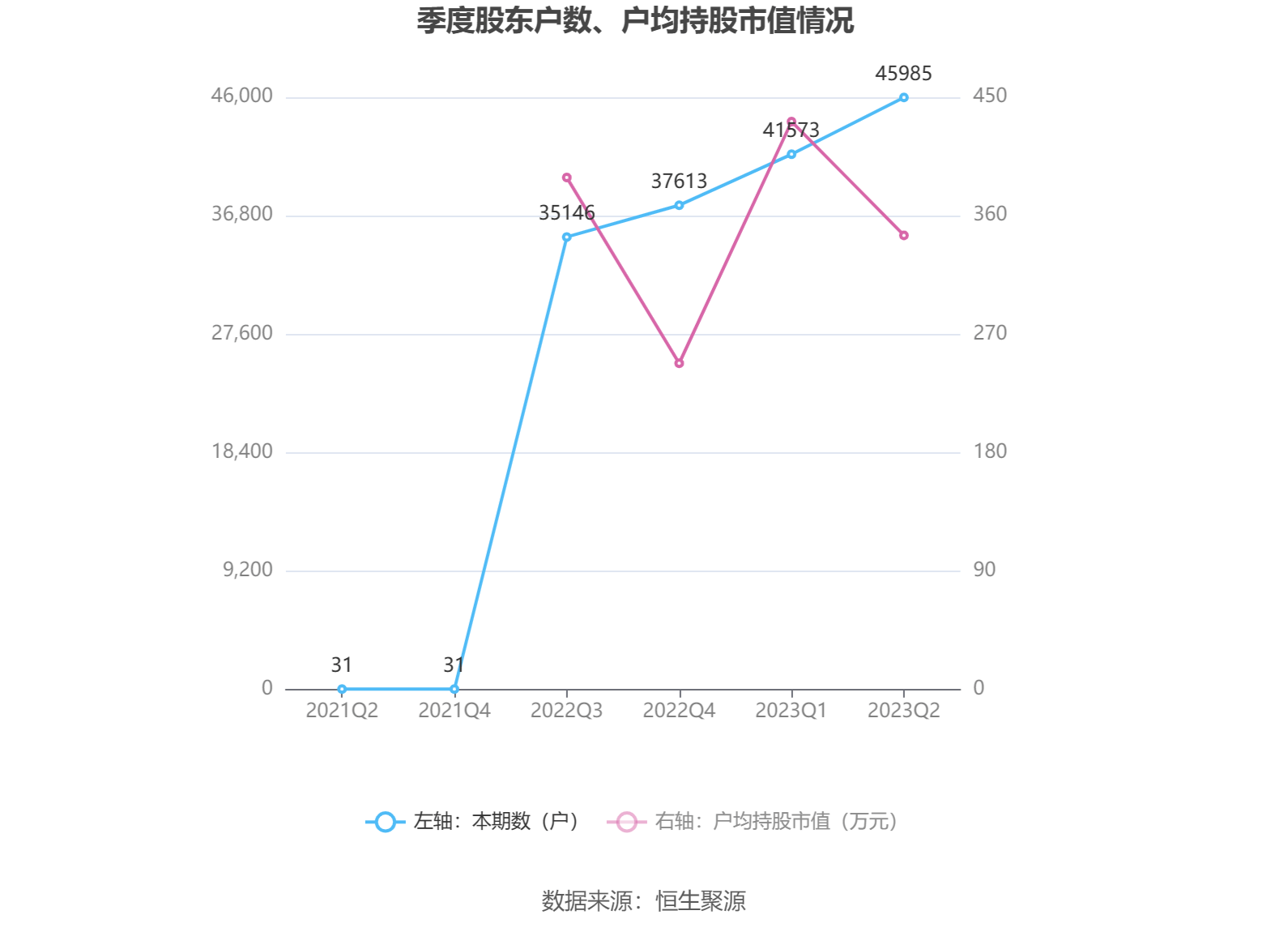 筹码集中度方面,截至2023年二季度末,公司股东总户数为4.6万户,较一季度末增长了4412户,增幅10.61%;户均持股市值由一季度末的431.46万元下降至345.07万元,降幅为20.02%。