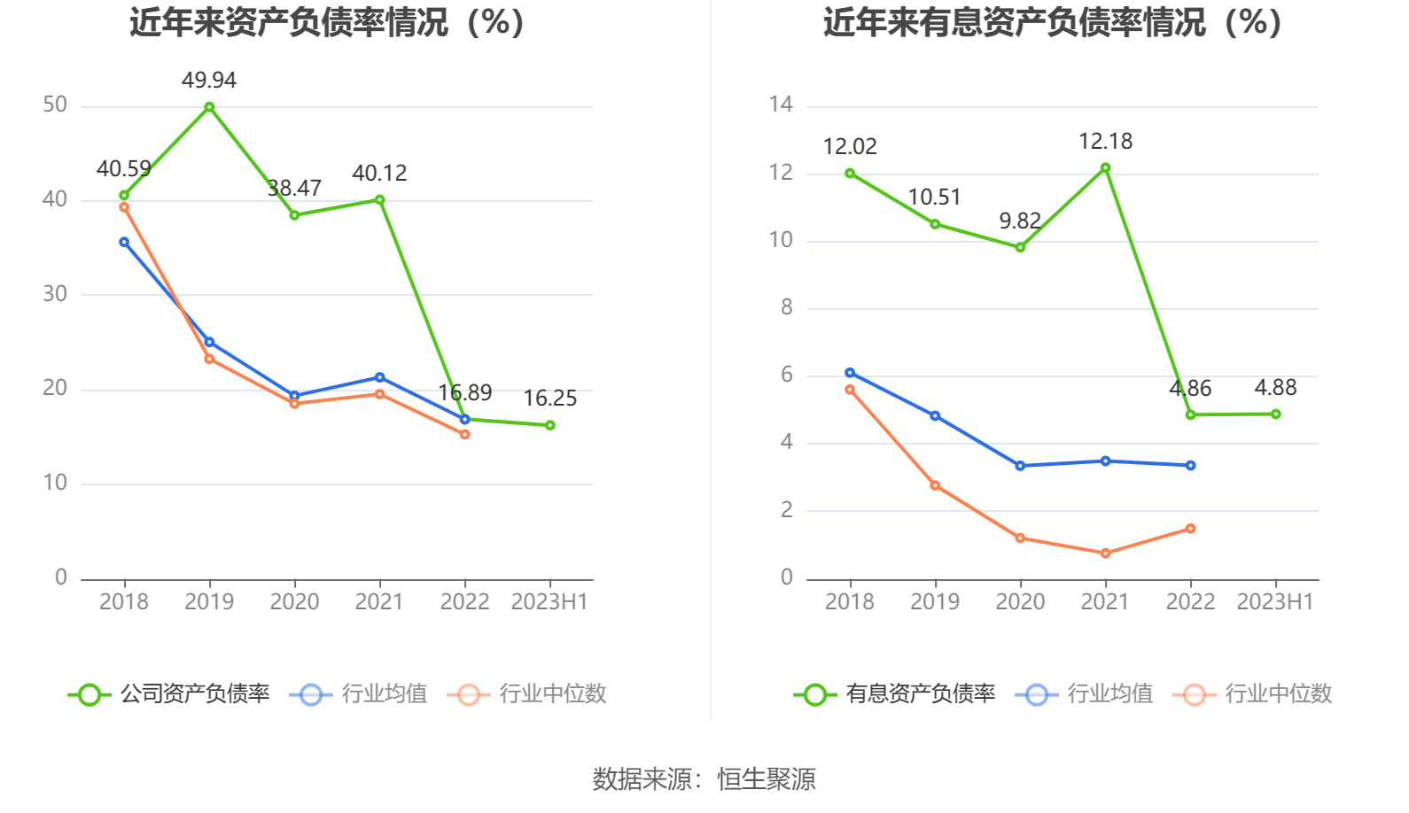 偿债能力方面,公司2023年二季度末资产负债率为16.25%,相比上年末减少0.64个百分点;有息资产负债率为4.88%,相比上年末增加0.02个百分点。