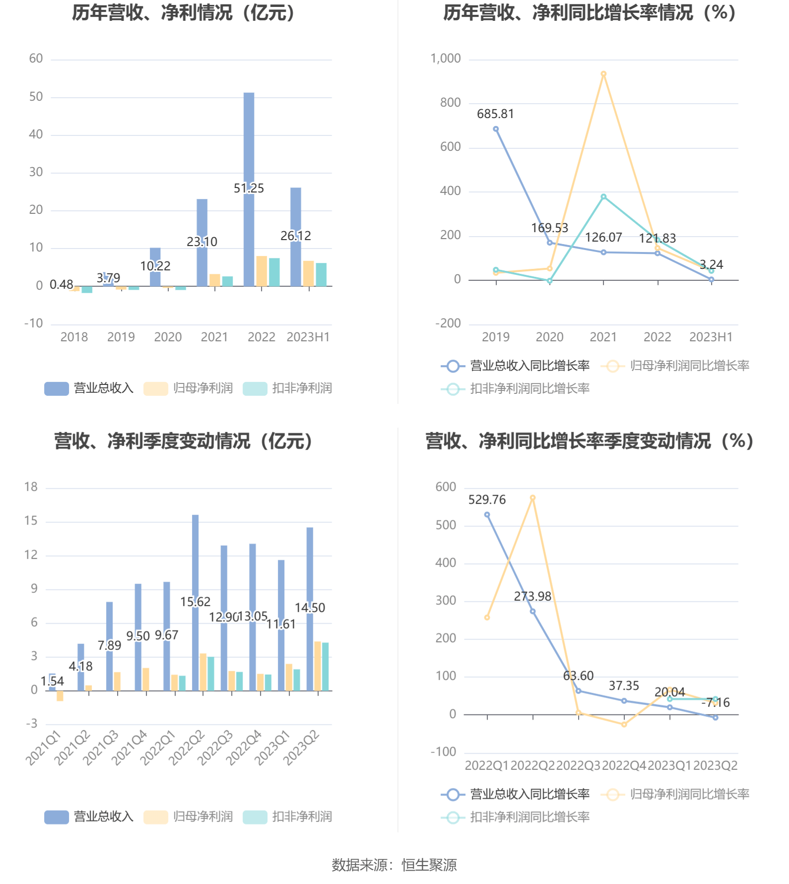根据半年报,公司第二季度实现营业总收入14.5亿元,同比下降7.16%,环比增长24.89%;归母净利润4.38亿元,同比增长31.77%,环比增长82.99%;扣非净利润4.28亿元,同比增长42.03%,环比增长124.92%。