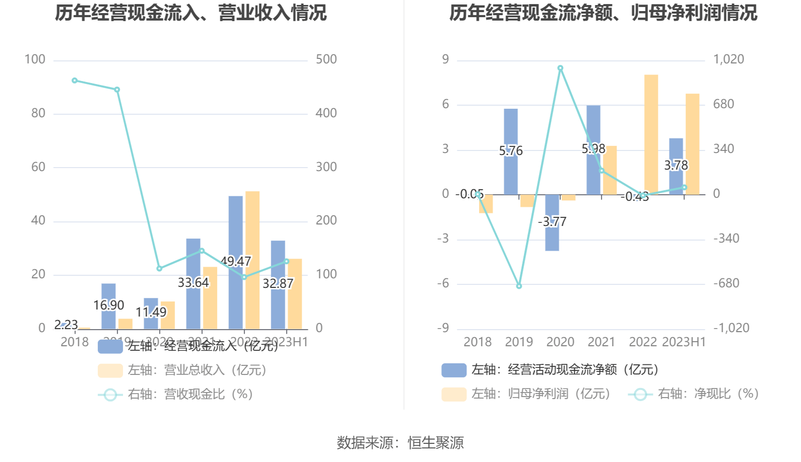 2023上半年,公司经营活动现金流净额为3.78亿元,同比增加12.35亿元,主要系销售商品收到的现金增加较大,经营活动的现金流出略有减少,使经营活动的现金流量净额由负转正且增加较多;筹资活动现金流净额-7191.25万元,同比减少9.35亿元,主要系本年新增借款净额少于去年同期,同时新增分配现金股利所致;投资活动现金流净额-10.16亿元,上年同期为-6.97亿元,主要系新增定期存款所致。