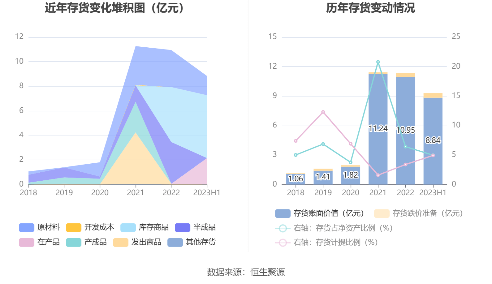 从存货变动来看,截至2023年上半年末,公司存货账面价值为8.84亿元,占净资产的4.98%,较上年末减少2.12亿元。其中,存货跌价准备为4590.47万元,计提比例为4.94%。