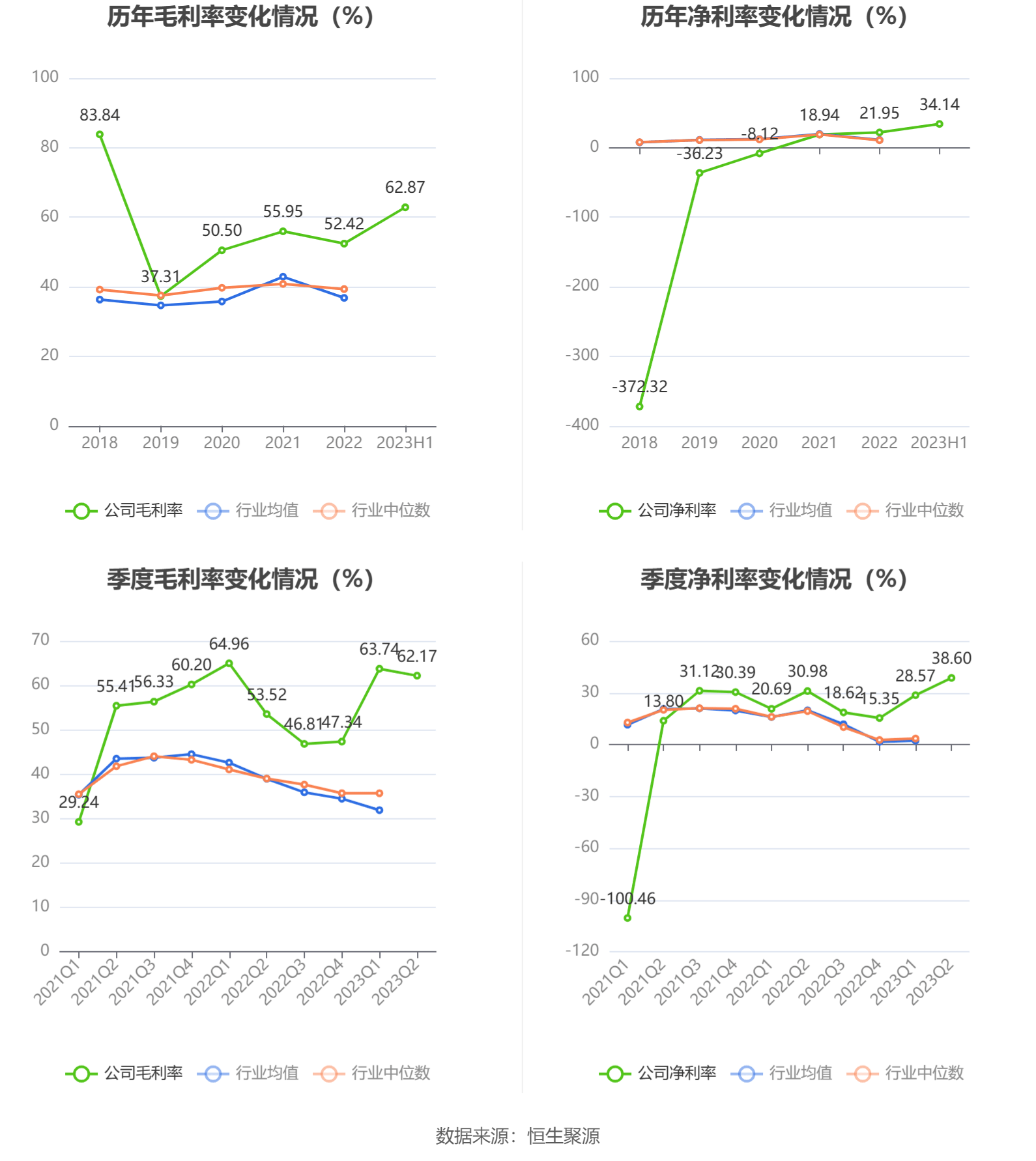 2023年上半年,公司毛利率为62.87%,同比上升4.97个百分点;净利率为34.14%,较上年同期上升7.10个百分点。从单季度指标来看,2023年第二季度公司毛利率为62.17%,同比上升8.65个百分点,环比下降1.57个百分点;净利率为38.60%,较上年同期上升7.62个百分点,较上一季度上升10.03个百分点。