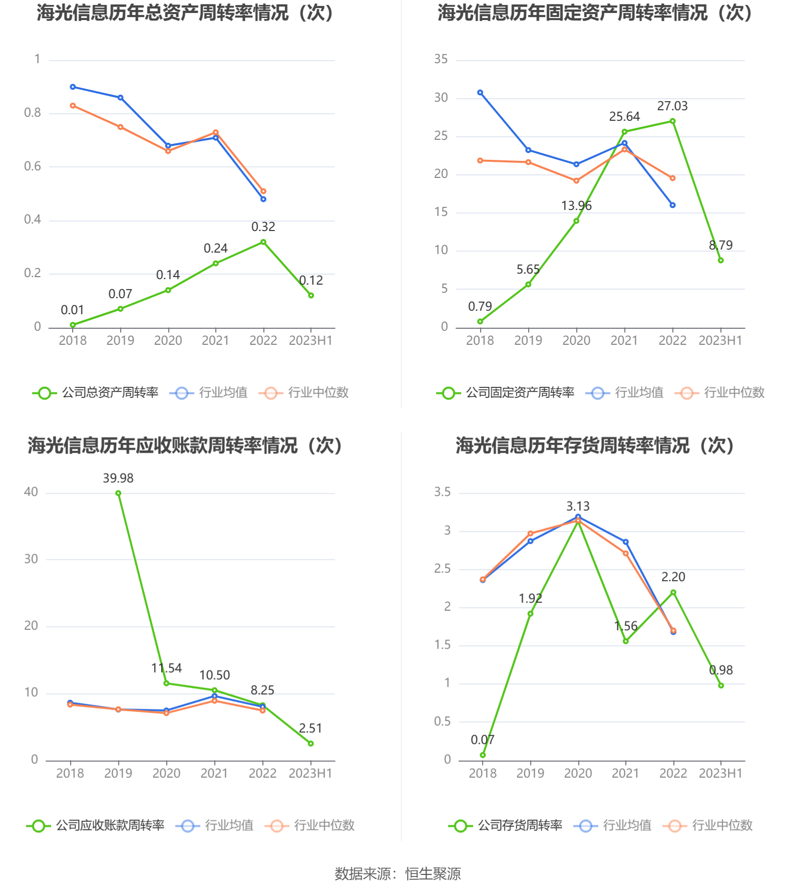 营运能力方面,2023年上半年,公司总资产周转率为0.12次,上年同期为0.23次(2022年上半年行业平均值为0.28次,公司位居同行业31/42);固定资产周转率为8.79次,上年同期为17.02次(2022年上半年行业平均值为9.95次,公司位居同行业13/42);公司应收账款周转率、存货周转率分别为2.51次、0.98次。