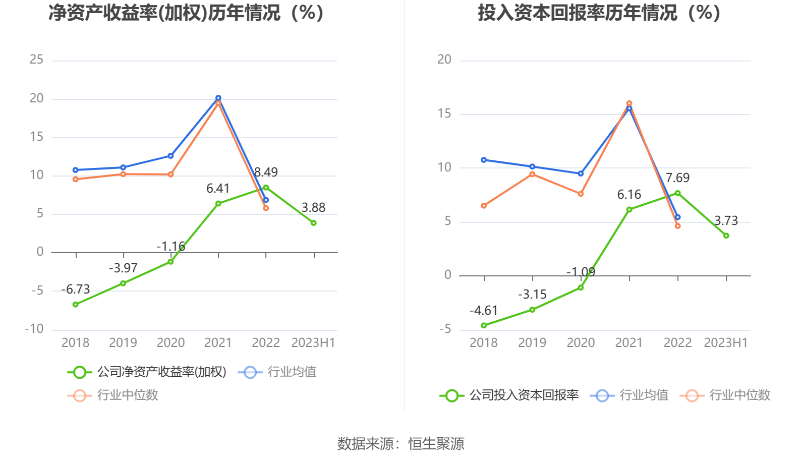 数据显示,2023年上半年公司加权平均净资产收益率为3.88%,较上年同期下降4.45个百分点;公司2023年上半年投入资本回报率为3.73%,较上年同期下降4.61个百分点。