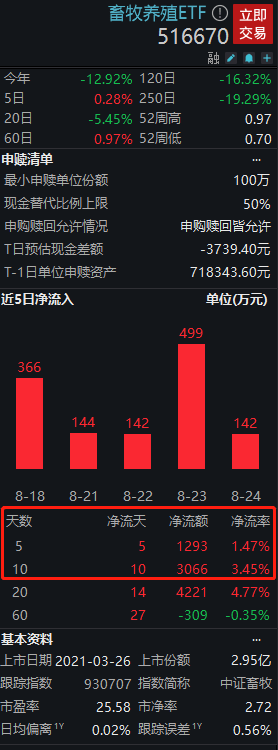 8月25日,养殖板块大幅上扬。截至10时6分,畜牧养殖ETF(516670)放量涨1.25%,一度涨2.37%;前几大权重股方面,温氏股份涨1.23%,牧原股份涨1.57%,海大集团跌0.15%,新希望涨3.13%,大北农涨1.84%,成分股晓鸣股份、新五丰、傲农生物、新希望、湘佳股份、罗牛山涨幅居前。至8月24日,该基金获资金连续10日净流入。