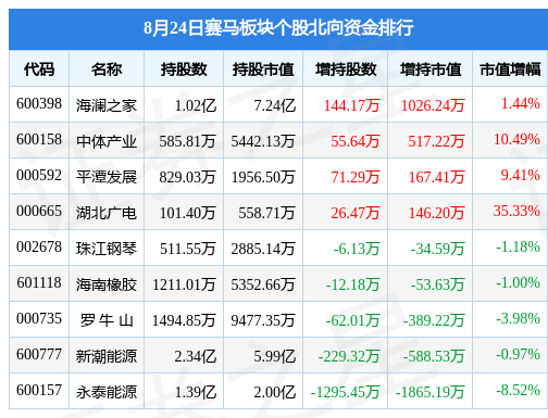 北向资金方面,当日赛马板块北向资金持股市值为17.8亿元,减持0.11亿元。其中增持最多的是海澜之家,增持了0.1亿元。减持持最多的是永泰能源,减持了0.19亿元。赛马板块北向资金持股变动明细见下表: