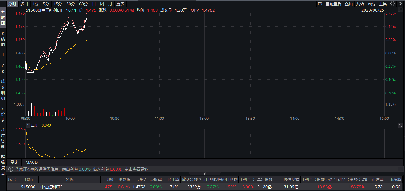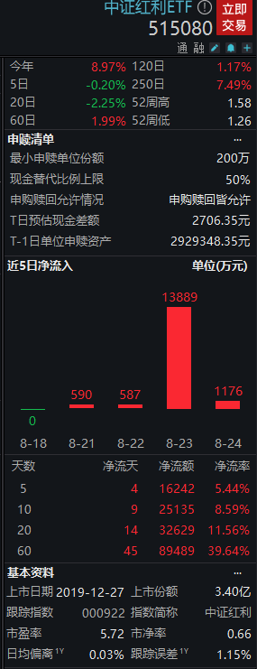 wind数据显示,中证红利ETF(515080)成立近四年以来(截至2023年8月22日)累计回报72%,年化近16%;在紧密跟踪标的指数的基础上,累计实现了逾50%的超额收益,而同期沪深300指数收益仅为-3.03%。据了解,作为类股票交易的场内品种,中证红利ETF(515080)的投资需要开立交易所证券账户,未开立相应账户的投资者可通过场外的联接基金(联接A:012643;联接C:012644;联接E:016363)借道参与。