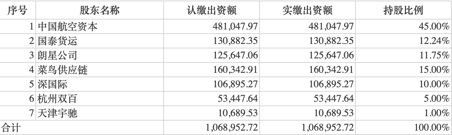 直到2022年6月,国货航有限整体变更为股份有限公司,整体变更完后,国货航的股权结构分别为中国航空资本持股45%、国泰货运持股12.24%、朗星公司持股11.75%、菜鸟供应链持股15%、深国际持股10%、杭州双百持股5%、天津宇驰持股1%。