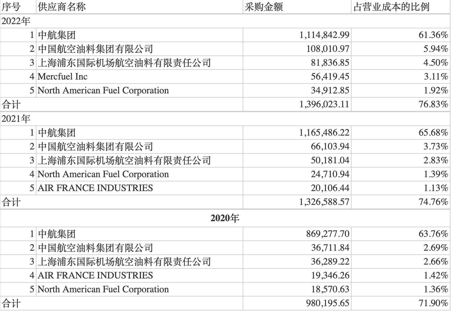 另外,国货航还存在供应商集中度高且依赖第一大供应商的情况。据招股书披露,国货航的主要采购项目为客机货运、航油、起降服务、维修服务等,2020年-2022年,公司向前五大供应商的采购金额分别为98.02亿元、132.66亿元和139.60亿元,占总采购额的比例分别为71.90%、74.76%和76.83%。其中,国货航向第一大供应商中航集团的采购金额占比分别为63.76%、65.68%和61.36%,占比较高。