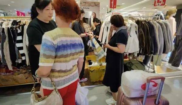 “一件、两件、三件……十二件,总共12件,4件99元,你这边总共297元,直接支付宝扫我。”在一个名为Body.ing的门店旁,收银的老板娘这样高声地算账。只见一位阿姨一次性采购了12件打底衫,还有一群阿姨排队等着试衣服,围着选购,甚至还有人推着行李箱。