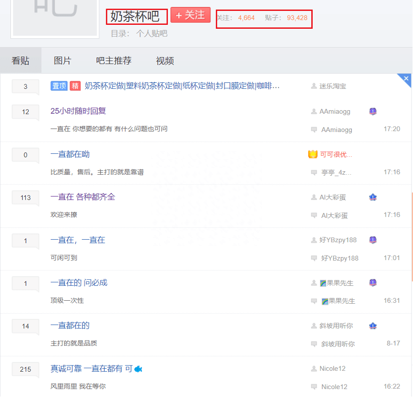 锌财经通过百度贴吧“奶茶杯吧”发现,该吧充斥着各种打广告的帖子,标题大多为“可到妇,全口味!”、“一直都在的”、“一直在 各种都齐全”......贴内则留有微信号。