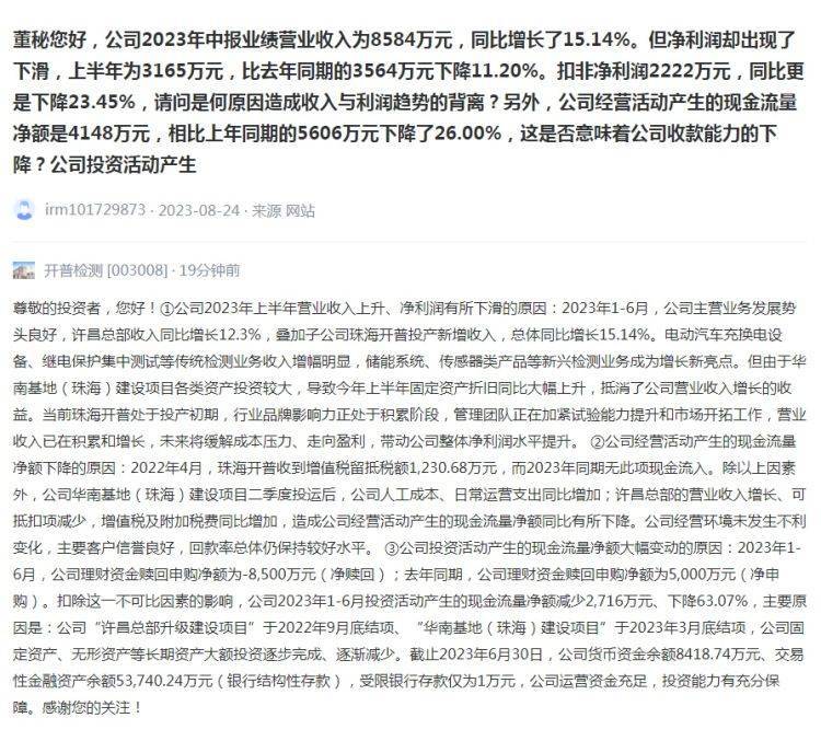 8月25日,有投资者在互动平台询问开普检测董秘,公司2023年中报业绩营业收入为8584万元,同比增长了15.14%。但净利润却出现了下滑,上半年为3165万元,比去年同期的3564万元下降11.20%。扣非净利润2222万元,同比更是下降23.45%,请问是何原因造成收入与利润趋势的背离?对此,董秘回答:①公司2023年上半年营业收入上升、净利润有所下滑的原因:2023年1-6月,公司主营业务发展势头良好,许昌总部收入同比增长12.3%,叠加子公司珠海开普投产新增收入,总体同比增长15.14%。电动汽车充换电设备、继电保护集中测试等传统检测业务收入增幅明显,储能系统、传感器类产品等新兴检测业务成为增长新亮点。但由于华南基地(珠海)建设项目各类资产投资较大,导致今年上半年固定资产折旧同比大幅上升,抵消了公司营业收入增长的收益。当前珠海开普处于投产初期,行业品牌影响力正处于积累阶段,管理团队正在加紧试验能力提升和市场开拓工作,营业收入已在积累和增长,未来将缓解成本压力、走向盈利,带动公司整体净利润水平提升。