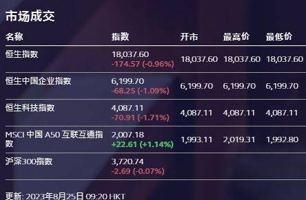 8月25日,受隔夜美股高开低走纳指跌近2%,中概指数走低的影响,昨日大幅反弹的港股低开明显,恒指跌0.96%,国指跌1.09%,恒生科技指数跌1.71%。