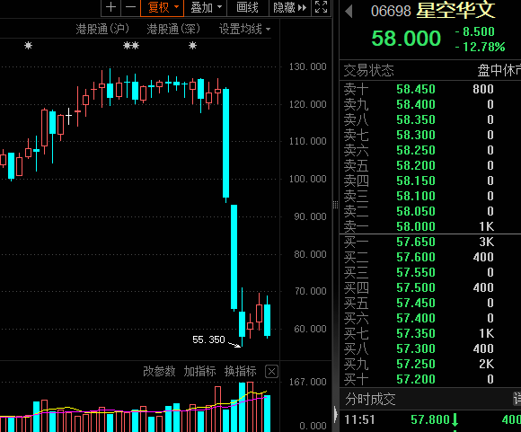 消息发布后,《中国好声音》母公司星空华文(HK6698)盘中大跳水。截至午间收盘,星空华文报58港元,跌幅12.78%,最新市值231.2亿港元。