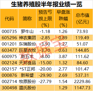 证券时报·数据宝统计显示,生猪养殖板块中9家上市公司已发布上半年业绩预告或半年报,均为亏损,其中天邦食品为转亏为盈,其余均为续亏。*ST正邦、新希望、牧原股份亏损幅度相对减小。