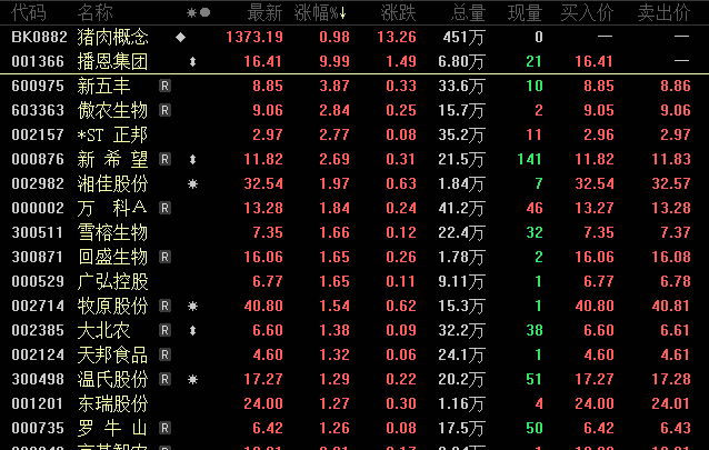 8月25日早盘,生猪养殖板块开盘后集体走高,随后有所回落,新五丰盘中最高涨8.57%,收盘涨3.87%,*ST正邦盘中最高涨4.5%,收盘涨2.77%,另外新希望、牧原股份、天邦食品盘中最高涨幅均在3%以上。