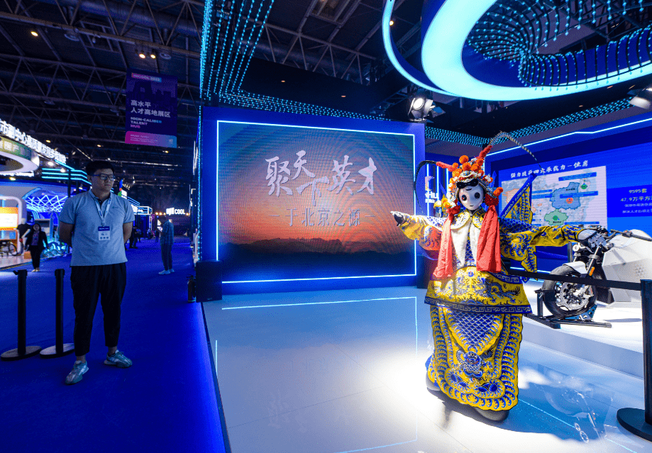 会跳舞的京剧机器人、工业级复合翼无人机……在北京高水平人才高地展区,一条灵感来自北京中轴线理念的首都人才中轴线大道引人关注。自北向南经过这条大道,左右两侧分别按照北京地图自北向南、东西左右的布局,依次排开各区展位。各区都拿出了优势产业和亮眼的高科技产品,秀出科技“肌肉”。