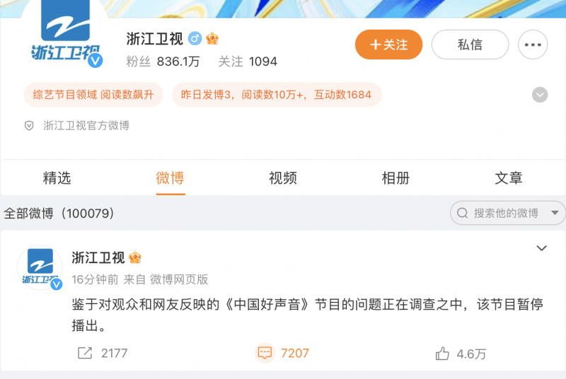 8月25日上午,浙江卫视官方微博发布消息称,鉴于对观众和网友反映的《中国好声音》节目的问题正在调查之中,该节目暂停播出。截至发稿,“好声音”制作方母公司星空华文控股有限公司(下称“星空华文”,06698.HK)股价从开盘66.50港元跌至54.85元港币。