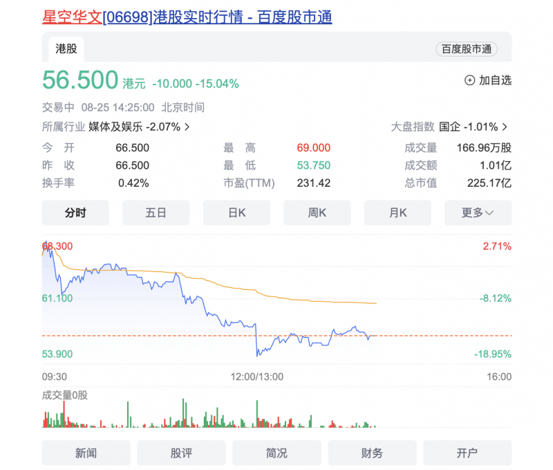 8月17日下午,一段长达9分钟的录音,将李玟与《中国好声音》节目组推上风口浪尖。8月20日,“好声音”电视端播出方浙江广电集团发文致《中国好声音》观众和网友,称将针对大家关心的问题进一步调查核实。在此期间,星空华文的股价一路下挫。8月18日开盘后下跌23.43%,市值蒸发115.59亿港元;下个交易日再次暴跌超30%;两日累跌45%,市值一度蒸发逾220亿港元。今日节目暂停播出的消息发出后,公司股价再次跳水。录音曝出至今,星空华文的总市值从8月17日收盘时的494亿港元缩水至232亿港元,缩水过半。