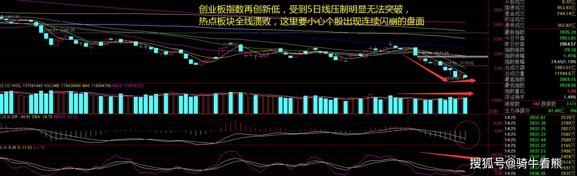 创业板指数周五低开低走,全天都没有出现强势翻红的走势,个股依然是不断下跌的盘面。周五出现了个股闪崩的局面,题材板块全线静默,近期最强的算力板块也出现了集体回调,这样的走势不得不让人胆寒。近期的高位强势股纷纷回调,低位股出现闪崩走势,看来有一部分资金已经“扛不住”了。接下来注意创业板指数能否在2000点之上稳住。