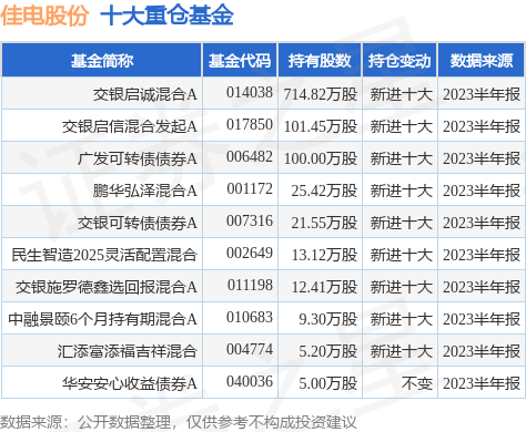 根据2023半年报公募基金重仓股数据,重仓该股的公募基金共12家,其中持有数量最多的公募基金为交银启诚混合A。交银启诚混合A目前规模为27.51亿元,最新净值1.0551(8月24日),较上一交易日上涨0.44%,近一年下跌3.99%。该公募基金现任基金经理为杨金金。杨金金在任的基金产品包括:交银趋势混合A,管理时间为2020年5月6日至今,期间收益率为152.12%;