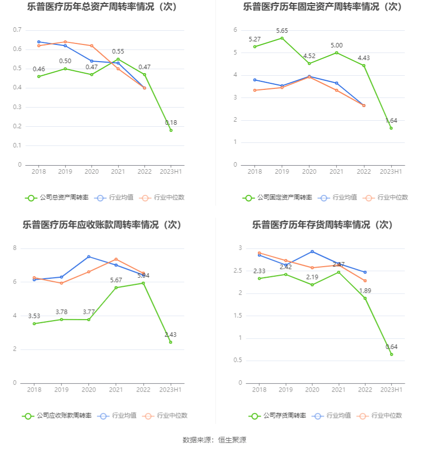 营运能力方面,2023年上半年,公司总资产周转率为0.18次,上年同期为0.25次(2022年上半年行业平均值为0.22次,公司位居同行业15/45);固定资产周转率为1.64次,上年同期为2.34次(2022年上半年行业平均值为1.64次,公司位居同行业13/45);公司应收账款周转率、存货周转率分别为2.43次、0.64次。