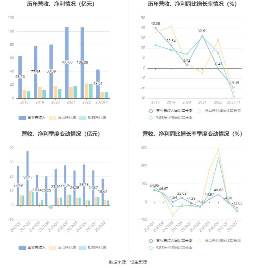 根据半年报,公司第二季度实现营业总收入18.64亿元,同比下降33.05%,环比下降23.51%;归母净利润3.65亿元,同比下降49.55%,环比下降38.93%;扣非净利润3.42亿元,同比下降52.19%,环比下降39.11%。