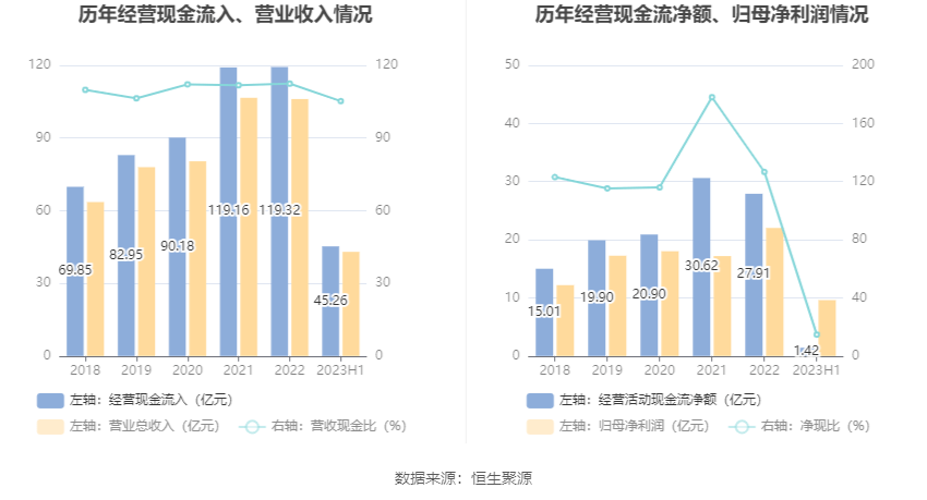 2023年上半年,公司营业收入现金比为105.22%,净现比为14.74%。