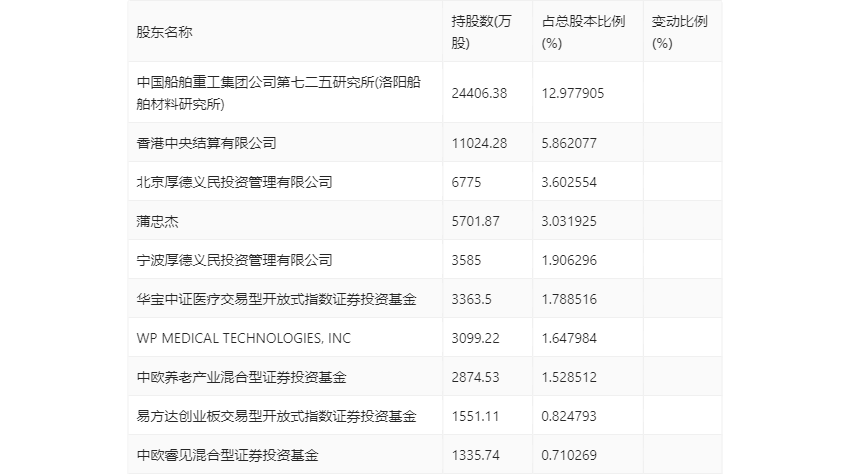 半年报显示,2023年上半年末的公司十大流通股东中,新进股东为易方达创业板交易型开放式指数证券投资基金、中欧睿见混合型证券投资基金,取代了一季度末的澳门金融管理局-自有资金、熊晴川。在具体持股比例上,香港中央结算有限公司、华宝中证医疗交易型开放式指数证券投资基金、中欧养老产业混合型证券投资基金持股有所上升,中国船舶重工集团公司第七二五研究所(洛阳船舶材料研究所)、北京厚德义民投资管理有限公司持股有所下降。